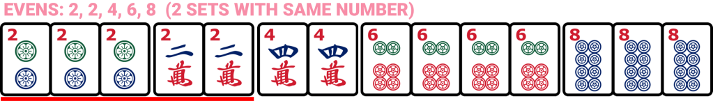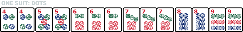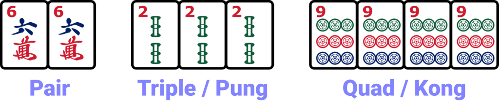 If you’ve played any Rummy card games, this rule will be familiar to you. All the tiles in your hand must be combined into sets, which are groups of 2, 3, or 4 identical matching tiles of the same suit and same number. There are names for the sets based on the number of tiles in the set: