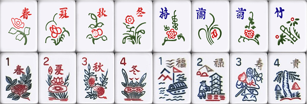 The images on flower tiles in Mahjong sets can vary greatly, and may have numbers or seasons printed on them, or other designs that may not look like flowers.
